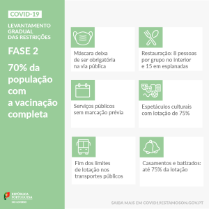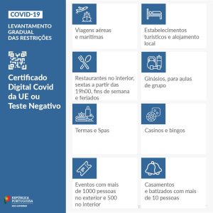 Entre as medidas gerais que se enquadraram nas três fases deste novo plano está a exigência de certificado digital de vacinação ou teste negativo à Covid-19 para restaurantes no interior às sextas feiras a partir das 19 horas e aos sábados, domingos e feriados durante todo o horário de funcionamento, assim como para viagens por via aérea ou marítima, estabelecimentos turísticos e alojamento local, termas e ‘spas’, casinos e bingos, eventos culturais, desportivos ou corporativos com mais de 1.000 pessoas (em ambiente aberto) ou 500 pessoas (em ambiente fechado) e casamentos e batizados com mais de 10 pessoas.