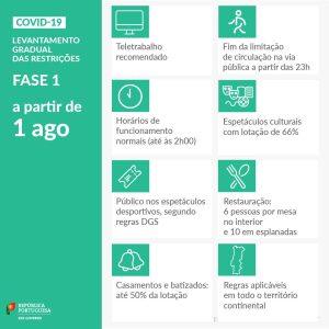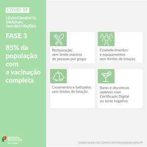 A primeira fase do plano de levantamento gradual das restrições começou no primeiro dia deste mês, quando 57% da população já tem vacinação completa, e determina o fim da limitação de circulação na via pública que era aplicada, diariamente, entre as 23:00 e as 05:00, aos concelhos de maior risco de incidência da Covid-19, assim como a possibilidade dos restaurantes e dos equipamentos culturais e desportivos funcionarem “de acordo com o horário do respetivo licenciamento, com o limite das 02:00, ficando excluído o acesso ao público para novas admissões a partir da 01:00, e de acordo com as regras da Direção-Geral da Saúde (DGS)”.