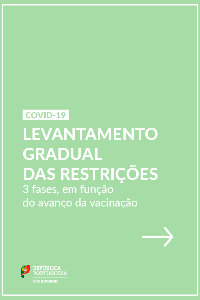 Com o controlo da pandemia da Covid-19 a passar a ser feito “em função do critério da taxa de vacinação da população portuguesa” e sem medidas diferenciadas para cada um dos 278 concelhos de Portugal Continental, o plano do governo de alívio das restrições prevê três fases para “libertação da sociedade e da economia, de modo progressivo e gradual”, segundo anunciou o primeiro-ministro, António Costa, após a reunião do Conselho de Ministros de 20 de julho passado, em Lisboa.